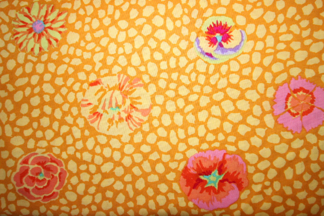 wunderschöner bunter Stoff von Kaffe Fassett, Muster: Punkte-Blumen, Farben gelb-ocker-lila-lachs.